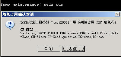 请注意:这里有两种方法分别是Seize和Transfer,如果原来的FSMO角色的拥有者处于离线状态,那么就要用Seize,如果处于联机状态,那么就要用Transfer。在这里由于SERVER已经离线了,所以要用“Seize”: