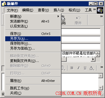 此时,您刚才所选的邮件被作为附件,夹在新邮件中;在“新邮件”对话框中选择菜单:文件(F)->另存为(A)...,然后为此邮件取个文件名即可,如图: