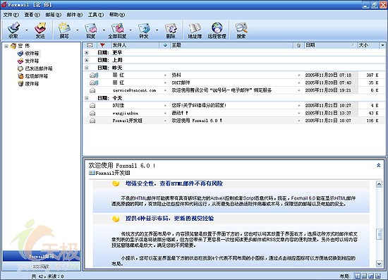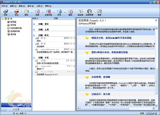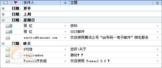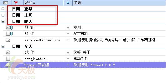 Foxmail 6.0 Beta1的邮件列表栏分出了“今天、昨天、上周、更早”几个分类项,每封邮件都会按照接收的时间分门别类地归属到相应的项目下。