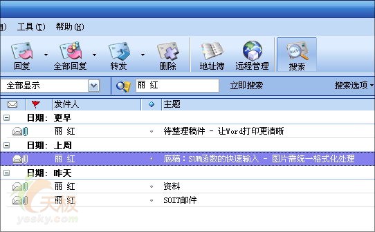 首先,点击工具栏上的“搜索”按钮,然后在弹出的“搜索”工具栏中输入好条件,最后再点击“立即搜索”按钮即可完成对邮件的过滤操作,此时出现在邮件列表中的就全都是符合条件的邮件了。如图5所示