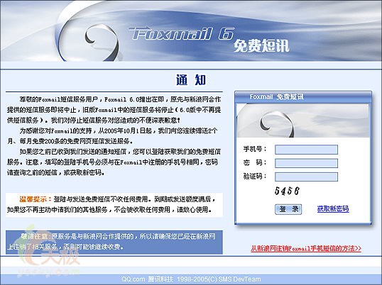 在Foxmail 6.0的下载页面上,有一个不太起眼的小链接“短信用户通知”,笔者点开以后,就出现了如图9所示的通知页面。