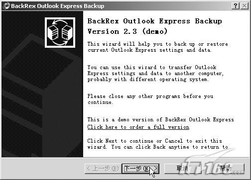 为了安全起见,请先关闭计算机中的所有程序,接着选择 “开始→程序→BackRex Outlook Express Backup Demo→BackRex Outlook Express Backup Demo”即可启动它,出现如图1所示的欢迎界面。