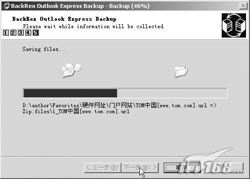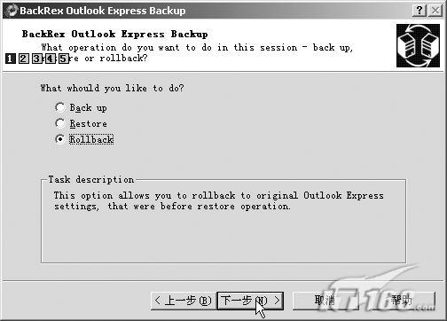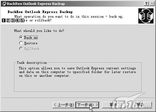 单击欢迎界面中的“下一步”按钮即可打开如图2所示的窗口。由于我们要备份Outlook Express,所以选择Backup(备份)项,再单击“下一步”按钮,此时会出现如图3所示的窗口。