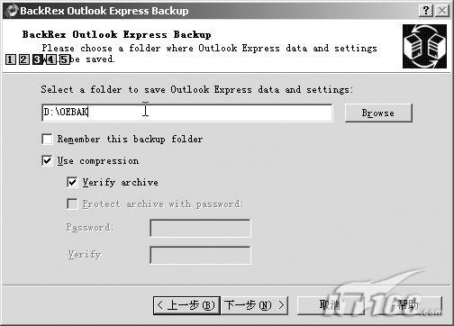 如果你使用的是注册版本,可选中图3窗口下方的Protect archive with password(加密设置文件)项,并在Password(密码)和Verify(校验密码)中输入密码来加密备份文件。同时,选中Use compression(压缩备份文件)项,则在OEB会把设置备份到压缩包中,从而为我们省下更多硬盘空间。
