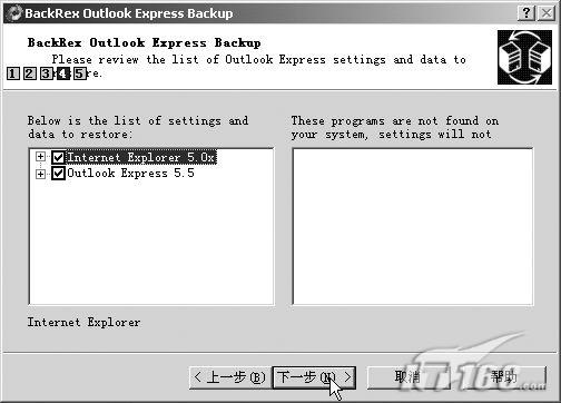 单击“下一步”按钮继续,此时会出现如图4所示的选择备份项目窗口。主要包括Internet Explorer 5.0x(包括Autocomplete 自动填充、Settings 设置、Cookies Cookies设置、History 历史记录、 Dialup拨号)和Outlook Express 5.5(包括Address Book 地址簿、Stationery 信纸、主标识下的Account Settings 账户设置、Settings设置信息、Message Rules 邮件规则、Blocked Senders 阻止人名单)。