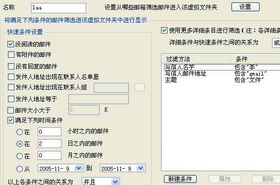 可以设置的条件很多,从而使得虚拟邮件夹可以有丰富的应用,比如设置条件“有附件的邮件”则可以列举出所有有附件的邮件,设置条件“一周内的邮件”则可以列举出所有一周内的邮件、设置条件“一周内的邮件”则可以列举出所有一周内的邮件、等等。