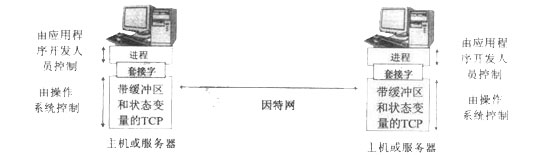 图3展示了通过因特网彼此通信的两个进程间的套接字通信(本图假设底层的传输协议是TCP,不过UDP也可以同样使用)。可见套接字是单台主机内应用层和传输层之间的接口。套接字也用于指代应用程序和网络之间的应用程序接口(application program interface,简称API),因为它又是用于构造因特网中的网络应用程序的编程接口。应用程序开发人员可以完全控制套接字的应用层一侧,对于套接字的传输层一侧却几乎无能为力。对于传输层一侧他们只能控制:(1)传输协议的选择;(2)诸如最大缓冲区大小和最大片段大小等有限几个传输层参数的调整。一旦选定某个可用的传输协议,就使用由该协议提供的传输层服务来构造应用程序。