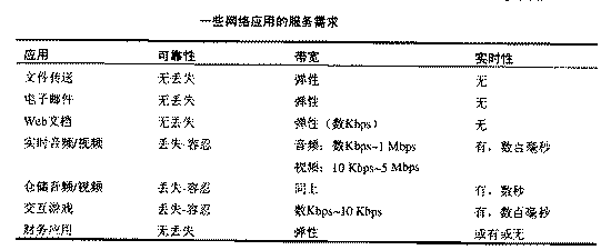 下表汇总了一些流行的和新兴的因特网应用的可靠性、带宽和实时性需求。这仅仅是一些较为流行的因特网应用的若干关键需求的概要。我们的目的并不是提供网络应用需求的一个完整分类,而是简单地标识出可由此将网络应用需求归类的几个最重要的轴。