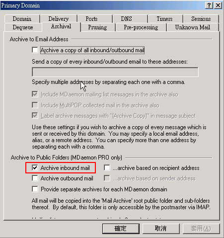 1. 依次点选“Setup”—“Primary Doamin”—“Archival”,勾选“Archival inbound mail”。这个设置可以将MD收到的邮件都备份一份到公共数据夹中。注意:因这里只是为方便收集邮件样本而设,在MD学习完成后要取消此项。