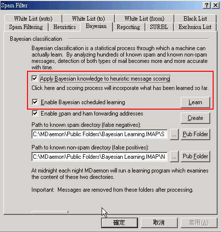 4. 再点取“Bayesian”,选取“Apply Bayesian knowledge to heuristic message scoring”和“Enable Bayesian scheduled learning”,其它用默认值即可。