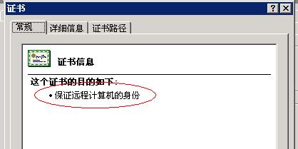 证书申请成功并安装后,可以点击查看证书,以查看证书。我们需要确保其中“证书目的”栏目中,有且仅有“确保远程计算机的身份”。