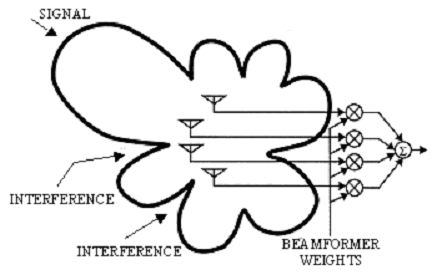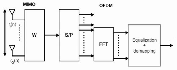 接收分集和干扰消除:如果基台和用户终端一侧三副接收天线,可取得接收分集的效果。利用“最大比值合并”MRC(maximal ratio combining),将多个接收机的信号合并,得到最大信噪比SNR,可能有遏止自然干扰的好处。但是,如有两个数据流互相干扰,或者从频率再利用的邻近地区传来干扰,MRC就不能起遏止作用。这时,利用“最小的均方误差”MMSE(minimum mean square error),它使每一有用信号与其估计值的均方误差最小,从而使“信号与干扰及噪声比SINR(signal to interference plus noise ratio)最大。