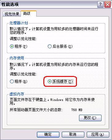 在“我的电脑”上单击鼠标右键,选择“属性->高级”,在“性能”下面单击“设置”按钮,在“性能选项”中选择“高级”页。这里有一个“内存使用”选项,如果将其设置为“系统缓存”,Windows XP 将使用约4MB的物理内存作为读写硬盘的缓存,这样就可以大大提高物理内存和虚拟内存之间的数据交换速度。默认情况下,这个选项是关闭的,如果计算机的物理内存比较充足,比如256M或者更多,最好打开这个选项。但是如果物理内存比较紧张,还是应当保留默认的选项,如图 3。