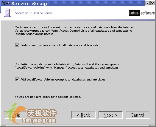 8、接着配置Domino服务器的安全设置,通过通过 ACL(访问控制表,Access Control List)来控制对目录的访问。例如,管理员可以根据给定组或位置中的成员资格来限制谁可以看到哪些内容,或者给予特殊用户在其自己记录中修改所选字段的能力。在Linux 2.4内核中,ACL作为补丁存在,而在2.6新内核中,它已经是标准内核的一部分了。传统Unix的ACL,只能对文件设定用户、组和其他人的权限,也就是我们常用的755、644之类的权限。如果想为一个文件交叉定义若干个不同组的用户访问权限,比如说tom、mary、tony、tod分别属于不同的组,某一文件想让mary和tony只读,tom和tod可写,其他用户不可访问。这种要求用传统的Unix ACL是无法实现的。Linux 2.6内核中的ACL正是为应付类似的需求所设计的。它可以方便地为文件配置任意用户和组的访问权限。 ACL 提供极其细粒度的访问控制,而且 ACL 将这种控制与 LDAP 安装结合在一起,而不是与请求信息的客户机结合在一起。此外,可以容易地将 LDAP 与大多数现有的安全性层和/或认证系统(例如 SSL、Kerberos 和 PAM 等)集成在一起,见图-5。按“NEXT”键后Lotus Domino /Notes 6.0服务器启动。
