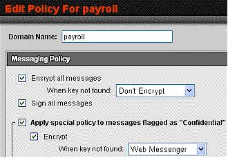 在接收者域名的方式中,我指定的是foobar.net这个域名(这假定就是前面我们所提到的老朋友Bob的域名),并且指定发送住这个域名的所有电子邮件都要被加密。而在信息主题的方式中,我是依照PGP公司提供的用户指南的指导,把“payroll”作为所指定的主题。