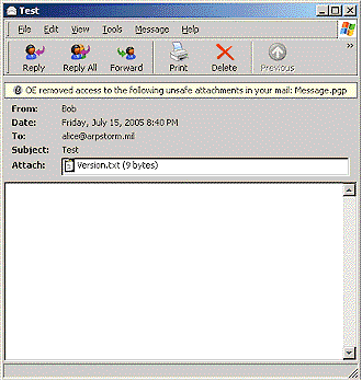 PGP Universal发送的加密邮件的方式是把该邮件作为某个信息的一个.pgp的附件来发送的(PGP Desktop组件也是一样的),具体如图12所示。这个附件然后被Universal、Satellite、Desktop或其他任何包含有收件人私钥的OpenPGP程序来解密,如图13所示。