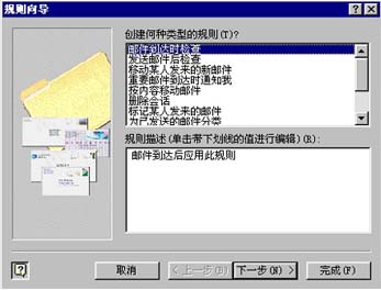 按“下一步”,便可以按你自己的需要建立一些“例外”的规则。除非你想加“除非来自个人或通讯组列表”,否则直接按“下一步”就可以。最后给这规则起一个名便可以完成整个过程。这个规则向导除了对垃圾邮件有用之外,在对付病毒的问题上,亦可以起不少的作用。还可以设置让邮件到达时要进行检测,如果有病毒,一般来说只要我们不打开它,这病毒就起不了作用的。