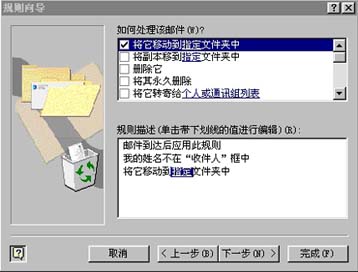 在这个界面中就要选择如何处理符合上述条件的邮件,一般情况下我们会选择将其移到指定的文件夹,当然如果你不需要也可以直接选择“永远删除”选项。若你只选“删除它”,Outlook 2000会把邮件放到垃圾箱,在垃圾箱的邮件是可以随时可以恢复的。而永远删除,则是直接删除,不能再取回。在“规则向导”的窗口下半部分有“规则描述”的一栏。点击最后一行“将其移动到指定文件夹”中带下划线的“指定”,在这里可以具体的选择移动到哪个文件夹。