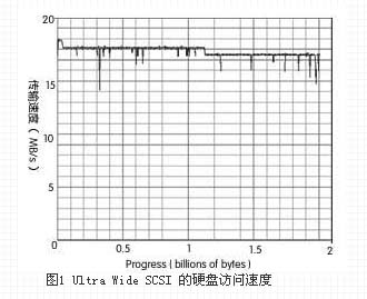 提高SCSI总线效率必须关注SCSI设备端的配置和传输线缆的规范和质量。图1和图2为分别为比较典型的Ultra Wide SCSI(40MB/s)和Ultra 3 LVD SCSI(160MB/s)的实际访问速度(Winbench 99测试)。可以看出,Ultra 3模式下获得的实际访问速度还不到Ultra Wide模式下实际访问速度的2倍。