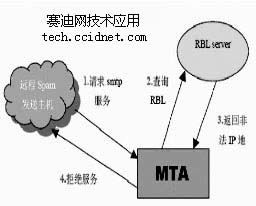 目前国际上比较流行的反垃圾邮件技术是,针对每一个进入的邮件信息,MTA程序获得远程服务器的地址,并查询远程互联网服务器对该地址进行认证。如果该地址在已知垃圾邮件主机列表中,则MTA程序拒绝接收这些进入的邮件信息。