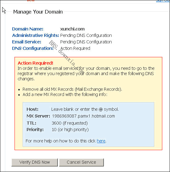 8. 设置好之后,回到 MSN 邮局申请窗口,点击“Verify DNS Now”。