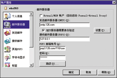 首先在Foxmail中选中你的邮件账户,执行“账户→属性”命令,切换到“邮件服务器”选项卡,分别修改其中“POP3服务器”、“POP3邮箱帐号”为“127.0.0.1”、“邮箱的POP3服务器地址/110/邮箱的用户名”,单击“高级”按钮,在弹出窗口中将“POP3 服务器端口”设置为“9999”。例如笔者是user@126.com的邮箱,则将“POP3服务器”设置为“127.0.0.1”,将“POP3邮箱账号”设置为“pop3.126.com/110/user”,“POP3服务器端口”设置为“9999”。