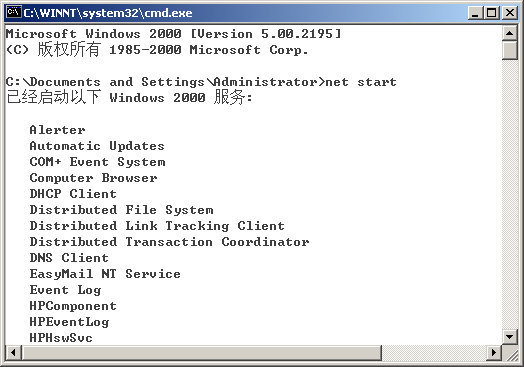 其实,利用Windows 2000 Server系统内置的“net start”命令,你就可以清楚地知道当前系统开启了哪些服务并及时禁止来路不明的服务。先打开系统的运行对话框,然后在其中输入“cmd”命令,单击回车键后,屏幕将会被切换到MS-DOS状态。在DOS命令行下,你可以直接执行“net start”命令,随后系统将自动把当前已经启动的服务都列出来(如图1所示);仔细检查有哪些服务属于来历不明的,然后在命令行中执行“net stop server”命令(其中Server就是具体的某项不明服务),将该不明服务暂时停止掉。