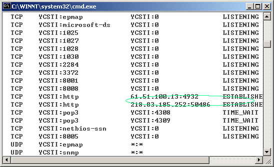 用命令的方法检查网络连接时,可以直接在DOS命令中输入“netstat -a”字符串,单击回车键后,你将会在图2所示的网络连接列表中,看到究竟是谁在暗中连接你的服务器。从图2界面不难看出,目前已经有来自“61.51.100.13”主机的4932端口、来自“218.83.185.252”主机的50486端口与服务器建立了HTTP方式的连接。