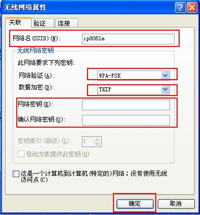 4.在装有无线网卡的客户端上,进入“无线网络连接 属性”窗口的“无线网络配置”页面。点击“添加”按钮,输入要连接的无线网络的SSID,选择“网络验证”方式为“WPA-PSK”,接着在“数据加密”栏选择“TKIP”并填上“网络密码”(图8)。