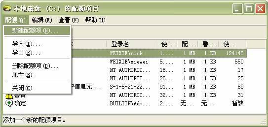 7.但是如果配置对系统中所有用户生效的话,显然很不方便用户对系统的操作,而在磁盘配额功能中还提供了一个针对不同用户划分使用空间的功能。实现方法也非常简单。首先点击配额配置窗口中的“配额项”按钮,这时会弹出“分区配额项目”的窗口,点击窗口左上方的“配额”选项,再选择其中的“新建配额项”(图2),这时会弹出一个选择用户的窗口,在其中填入或者选择系统中的一个用户名(如XieWei),确定之后就会出现一个针对该用户使用磁盘空间限制的选项,而大家可以根据该用户在系统中的权限和使用情况,合理地为该用户指定使用空间,这样配置既不影响系统常规的操作,同时也加强了系统的安全性。
