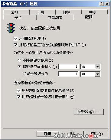 如果选中“拒绝将磁盘空间给超过配额限制的用户”选项,超过其配额限制的用户将收到来自Windows的“磁盘空间不足”的错误信息,并且在没有从中删除和移动一些现存文件的情况下,无法将额外的数据写入卷中。如果清除该复选框,则用户可以超过其配额限制。如果 不想拒绝用户对卷的访问但想跟踪每个用户的磁盘空间使用情况,可以启用配额而且不限制磁盘空间的使用。也可指定当用户超过配额警告级别或超过配额限制时,是否要记录事件。