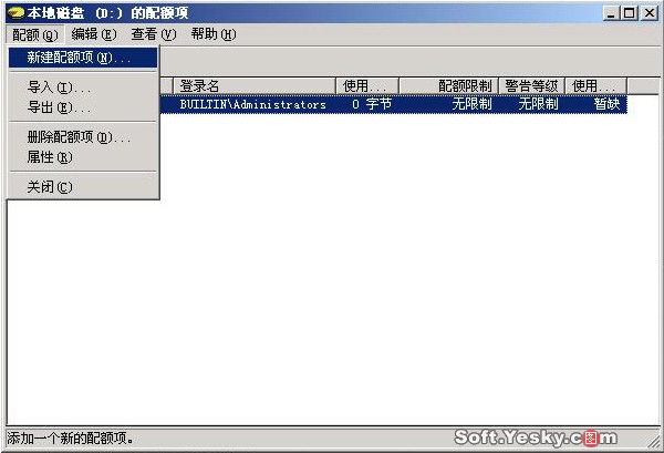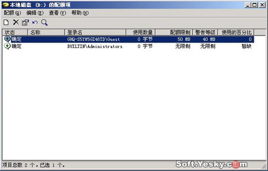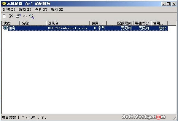 进入磁盘配额项目管理的方法如下:在采用NTFS文件系统格式的驱动器 (如D:\)上单击右键,选择“属性”项,进入“驱动器属性”对话框;选择“配额”选项页,点击“配额项”按钮,进入“配额项目”窗口,如下图所示。
