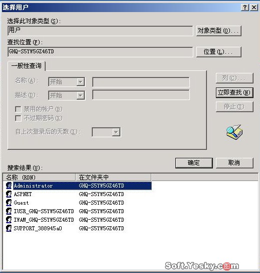 ⑤如果不知道用户的确切名称,可以使用高级查找功能以查找用户。单击“选择用户”对话框中的“高级”按钮,将显示选择用户高级选项对话框。单击其中的“立即查找”按钮,即可在“搜索结果”下拉列表框中显示出当前计算机的所有用户。