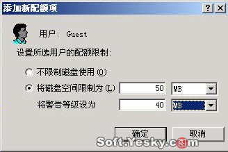 ⑦单击“确定”按钮,将显示“添加新配额项”对话框。在其中的“设置所选用户的配额限制”下方,选中“将磁盘空间限制”单选按钮,并在其后文本框中为该用户设置访问磁盘的空间。
