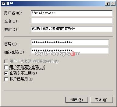 打开“管理工具”----“计算机管理”----“本地用户和组”----“用户”,图31。双击Administrator进入其属性,记下其描述,图32,并从新修改为其他描述。然后在“用户”上单击右键,选择“新用户”,写上如图33所示资料后确定。