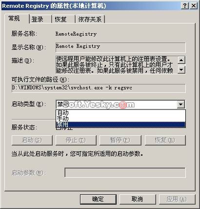 从“管理工具”里打开“服务”,图20。可以看到系统所有服务的具体情况。这里仅以典型的Remote Registry服务为例介绍,目的在于提供一个安全配置服务的方法。在服务列表里找到Remote Registry服务,可以看到左面空白部分对这一服务的解释为“使远程用户能修改此计算机上的注册表设置。如果此服务被终止,只有此计算机上的用户才能修改注册表……”,可以看出,正常情况下并不需要这项服务,而且如果启用这项服务还可能给系统带来安全隐患,所以必须禁用。双击Remote Registry服务进入其属性设置,图21。在“启动类型”里把默认的“自动”修改为“禁用”,最后确定即可。当此服务被关闭后,一切和注册表有关的远程行为都被终止,这也使得一些恶意网页对本地注册表的修改成了泡影,网上的恶意用户也别想对注册表进行修改和设置,大大降低了系统被破坏和被中上木马的几率,达到了维护系统安全的目的。