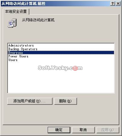 从“管理工具”里打开“本地安全设置”,图26。其中的密码策略、帐户锁定策略、审核策略、拥护权限分配、安全选项等都需要仔细配置。笔者以“用户权限分配”为例介绍方法。选中“用户权限分配”后可以看到可进行某一行为的所有默认组,如图26中第七项,可以看到一共有5个组的用户拥有从远程访问计算机的权限,这是不符合我们的安全要求的,需要从新配置。双击这一项打开其属性,图27。这里可以删除Everyone、Power Users和Users组,或者也可以单击“添加用户或组”来从新确定可从远程访问此计算机的用户或组。参考图5和图8。