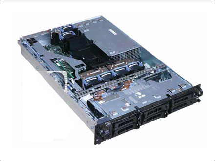 PowerEdge 2850是去年推出的Nocona系列产品中较早的一个。在去年诸多产品显赫一时,虽然经过了半年其他新品的冲击,但其强劲的实力仍保持的领跑的劲头。在黑色沉稳的2U机箱中,同样采用两颗新Xeon架构Nocana处理器,最高支持3.4GHz;配有6根DIMM插槽最大支持24GB DDRII 400内存,充分发挥E7520芯片组的优势,不过没有直接提供PCI-E接口支持。不过配有3个PCI-X扩展槽以及双千兆以太网,都可以满足用户扩展需求。