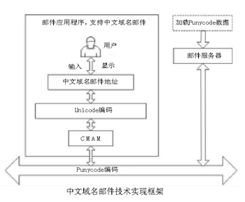 在邮件客户端,用户输入一个中文域名邮件地址,系统将本地编码翻译成Unicode编码,通过中文域名邮件地址处理模块(CMAM)转换得到对应Punycode编码,提交邮件服务器。或者相反,通过CMAM,将接收到的Punycode表示的邮件地址,最终转换成本地编码显示给用户。
