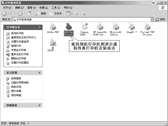 果冻提示 如果虚拟打印机安装成功,那么我们可以在任务栏上依次点击“开始→设置→打印机和传真”,在打印机文件夹内可以看到一个名为APF Fax Printer的打印机(图2)。