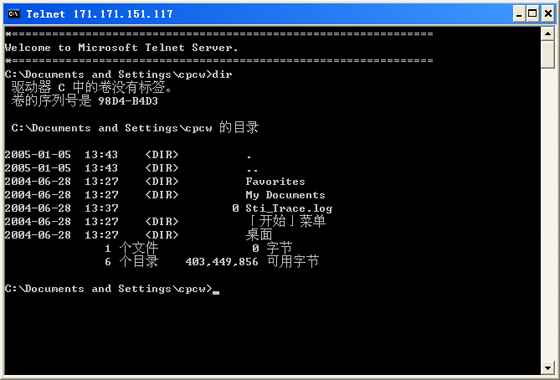 最后回到Win XP客户端,按照上面Telnet的登录步骤,即可顺利进行登录了(图2)。现在我们已经可以对服务端进行远程控制,在DOS状态下进行简单的文件操作及远程管理工作了。