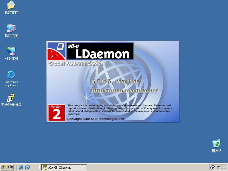 试验环境:Windows Server 2003 ENT SP1 VOL CHS;DNS服务;MDaemon 7.2.3英文版;LDaemon 2.1.0;域名:maytide.net,解析记录:www —> 10.0.0.1,mail —> 10.0.0.1,父域 —> 10.0.0.1,MX 父域 —> mail;公司名:maytide;国家:CN;OE6;Outlook2003