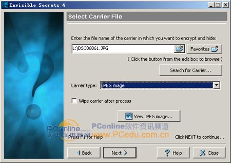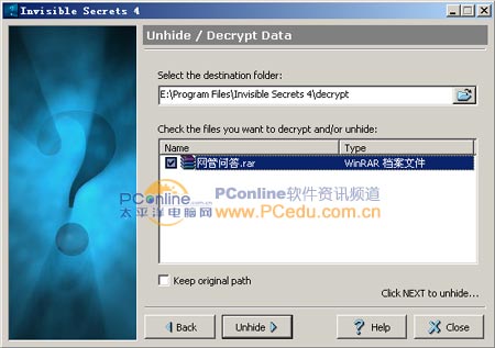 将图片保存下来后,运行Invisible Secrets,在主界面上单击“Unhide Files”按钮,在打开的窗口中将接收并保存的图片添加进来,然后单击“Next”在打开的窗口中输入解密口令,这样即可看到里面隐藏的文件,将其选中然后单击“Unhide”按钮即可将文件解压出来。