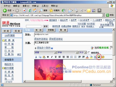 在这里我们以网易126信箱为例向大家介绍撰写HTML邮件的方法。登录126信箱并打开撰写新邮件窗口,单击新邮件窗口底部的“多媒体编辑器”按钮,这样撰写正文区域上方则会多出一排工具栏,单击“增加图片”按钮,在打开的脚本提示中输入文件所在详细路径并单击“确定”按钮,即可将捆绑后的图片添加进来。