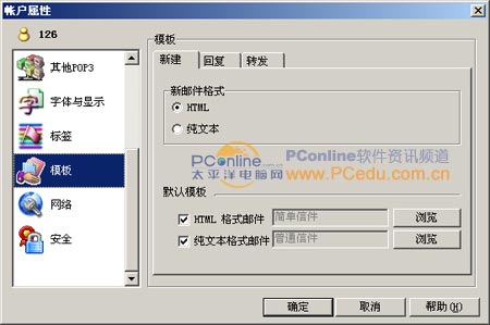 同样如果希望默认新邮件就是超文本格式的,那么可以打开该帐号的属性窗口,切换到“模板”标签,然后在“新建”选项卡中将“新邮件格式”设为“HTML”格式即可。