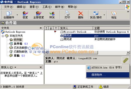 如果是Outlook Express,那么将其接收下来同样可以将其保存起来。如果邮件是以纯文本格式显示的,那么只要单击正文右上角的回形针按钮,在打开的菜单中选择“保存附件”,将HTML格式的邮件保存为HTML文件,保存好后打开HTML文件,即可从网页中将图片保存起来。