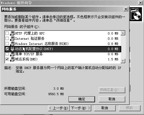 在Windows 2003服务器中,依次点击“开始→设置→控制面板”,运行“添加或删除程序”,在弹出的窗口中切换到“添加/删除Windows组件”页。接着在“Windows组件向导”对话框中选中“网络服务”选项,点击下方的“详细信息”按钮。在弹出的“网络服务”对话框中选择“动态主机配置协议(DHCP)”选项后(图1),点击“确定”按钮。然后在“Windows组件向导”对话框中点击“下一步”按钮,开始配置、安装DHCP服务,最后点击“完成”按钮即可。