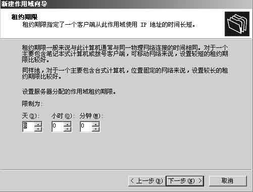 果冻提示 由于在“新建作用域向导”中,果冻只能对“租约期限”参数值进行时间调整,无法将它设置成“无限制”状态,因此他使用的还是默认值“8天”。