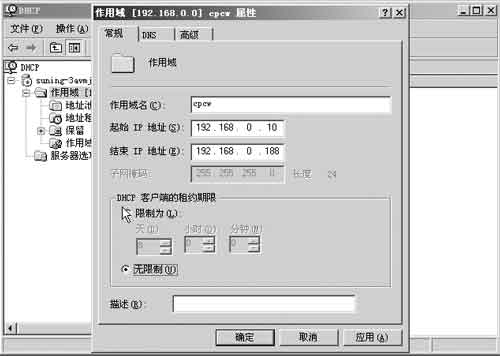 在DHCP服务器控制台窗口中,果冻右键点击名为“CPCW”的作用域,在弹出的菜单中选择“属性”,切换到“常规”标签页(图4),在“DHCP客户端的租约期限”框中选择“无限制”单选项,最后点击“确定”按钮。这样,“CPCW”作用域内的客户机申请的动态IP地址就会保持不变,冬瓜的烦恼也得到了解决。