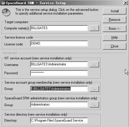要想对“BILLGATES”服务器中的“CPCW”共享文件夹进行磁盘配额限制,就先要给它远程安装“SpaceGuard SRM”服务。右键点击“BILLGATES”图标,在弹出的菜单中,依次选择“Service Management→Install/Remove”选项,弹出服务安装配置对话框,点击“Advanced”按钮,展开高级页面(图1),然后在下面的“Username”栏中输入远程服务器的管理员账号(如“BILLGATES\Administrator”),在“Password”栏中输入密码,在下面的“Group”栏中输入“\\BILLGATES\Administrators”,最后点击“Install”按钮,稍等片刻,就会完成该服务的安装。